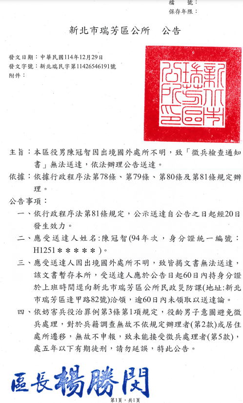 檢送新北市瑞芳區公所本區94年次役男陳冠智徵兵檢查通知書公示送達公告1份