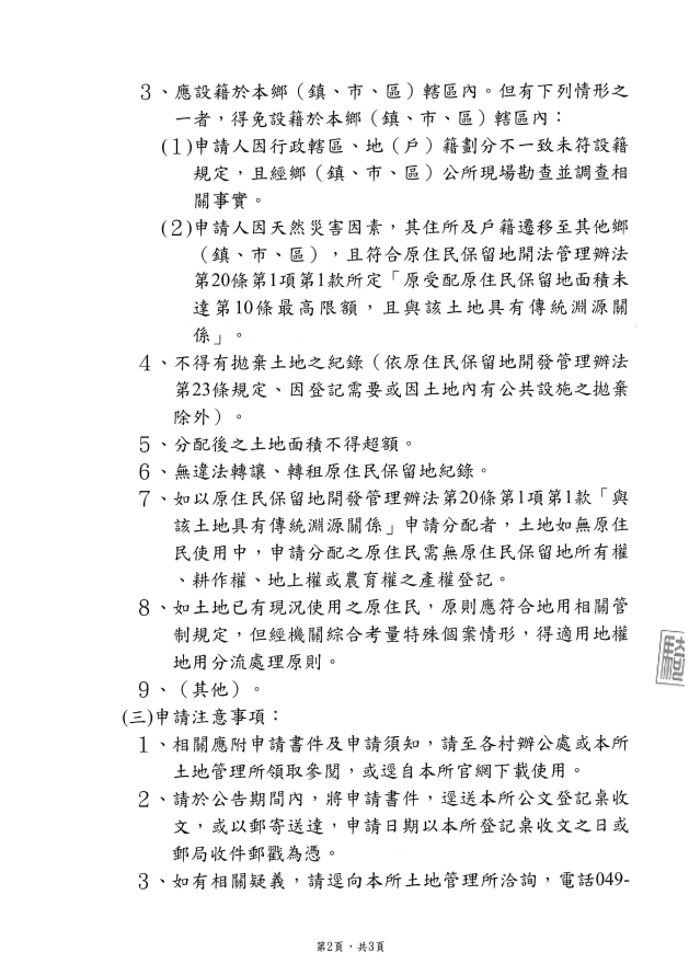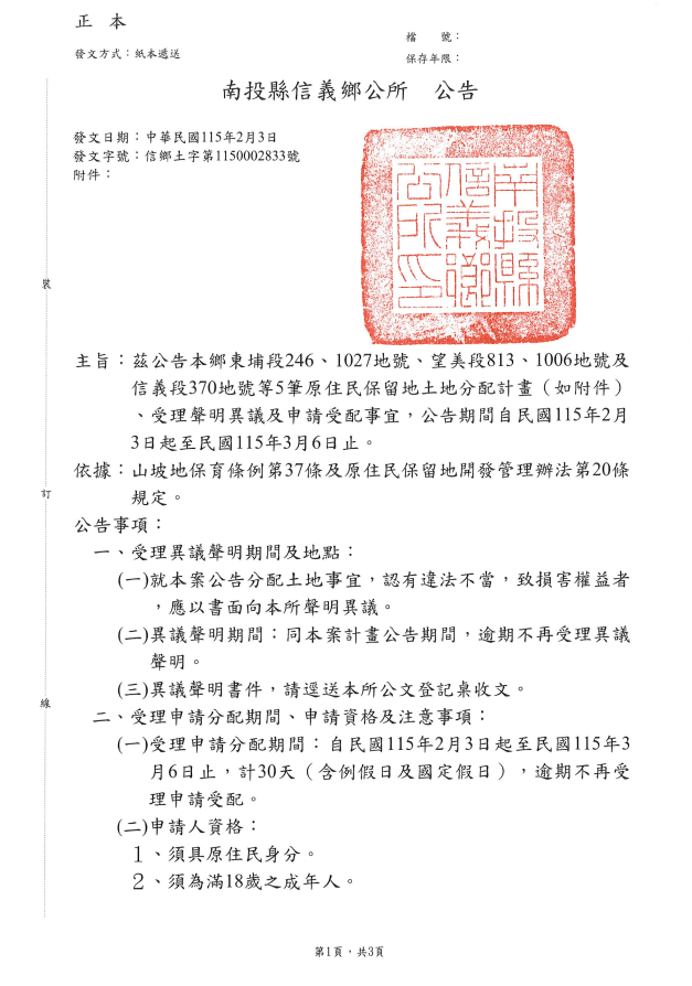 檢送南投縣信義鄉公所 辦理東埔段246、1027地號、望美段813、1006地號及信義段370地號等5筆原住民保留地公告受理申請分配1份(含分配計畫)公告 Attachments: 南投縣信義鄉東埔段246地號等5筆原住民保留地分配計畫[ ]2572 kB 上一篇 下一篇