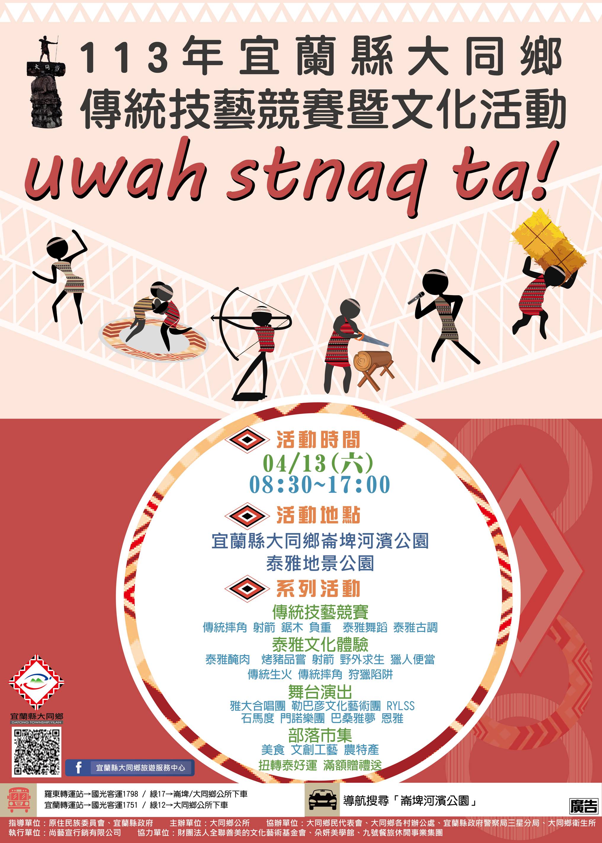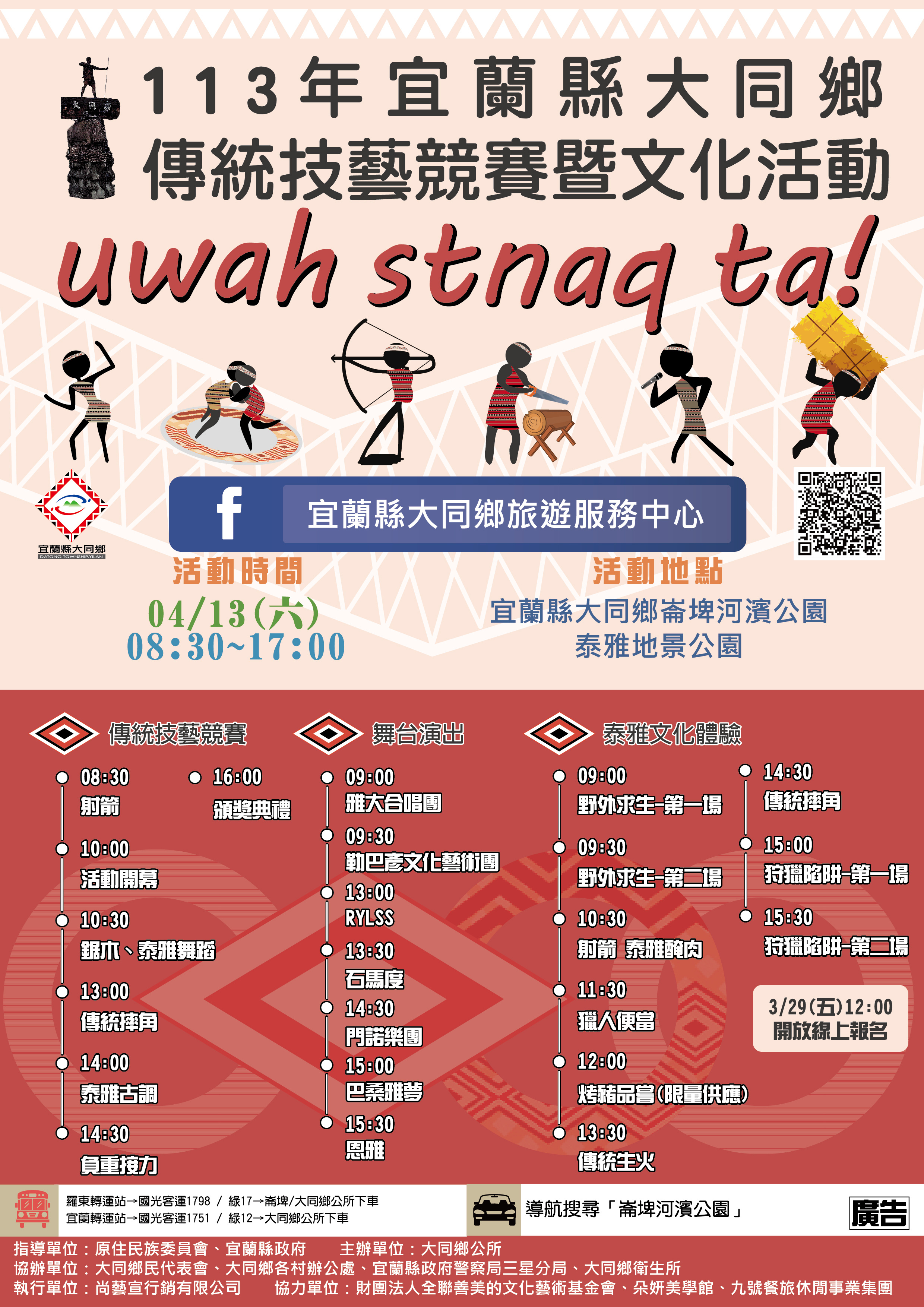 宜蘭縣大同鄉公所訂於113年4月13日(星期六)辦理「113年宜蘭縣大同鄉傳統技藝競賽暨文化活動」 Attachments: 活動海報-1[ ]3425 kB 活動海報-2[ ]550 kB 上一篇 下一篇