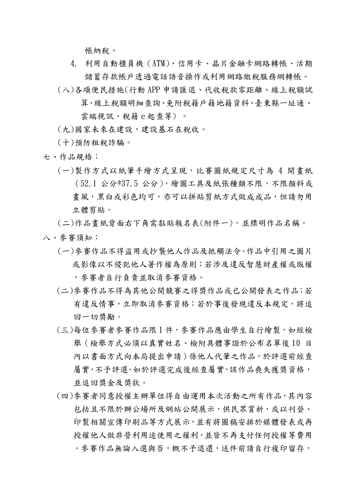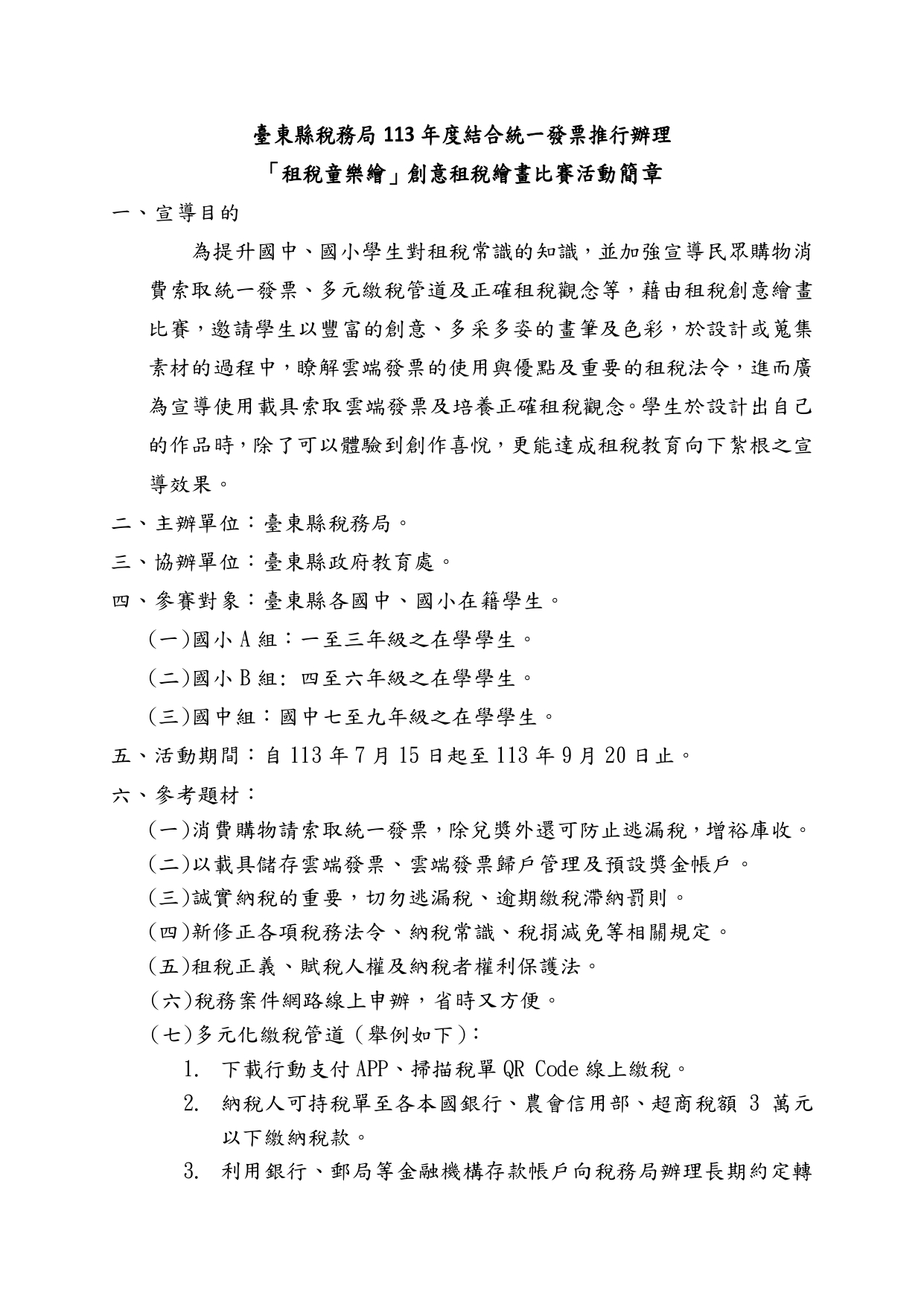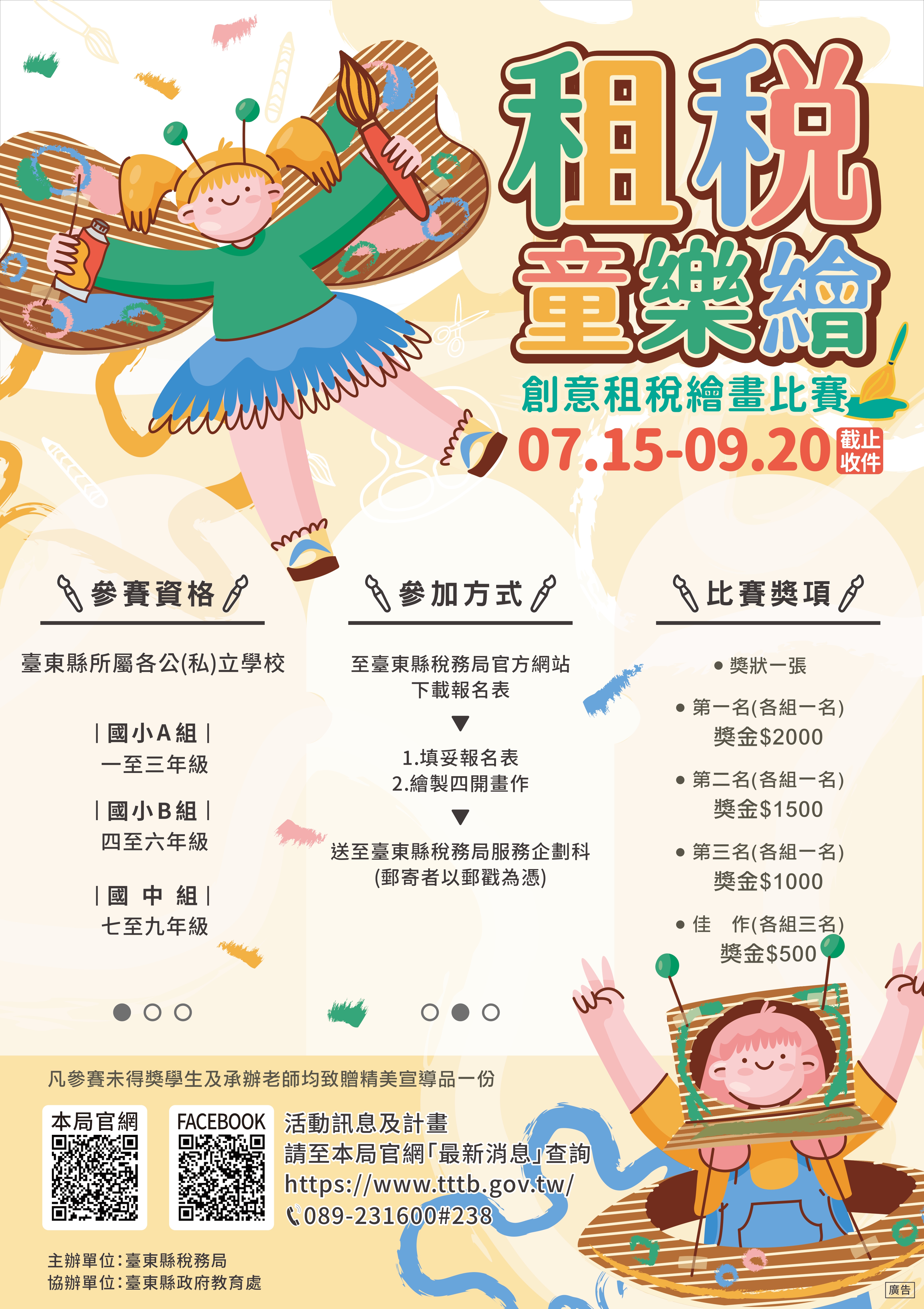 【協助公告】台東稅務局「租稅童樂繪」創意租稅繪畫比賽活動 台東稅務局 「租稅童樂繪」創意租稅繪畫比賽活動(一) 收件日期:自113年7月15日起至113年9月20日止。 (二) 參賽對象:臺東縣各國中、國小在籍學生。 (三) 比賽分組:國小A組(1至3年級)、國小B組(4至6年級)、國中組(7至9年級)。 (四) 獎勵辦法:各組選出前三名及佳作3名頒贈獎金及獎狀。 (五) 凡參加比賽之學生均致贈宣導品1份。 Attachments: 附件1[ ]191 kB 附件2[ ]248 kB 簡章1[ ]606 kB 簡章2[ ]688 kB 簡章3[ ]573 kB 簡章4[ ]477 kB 海報[ ]4564 kB 上一篇 下一篇