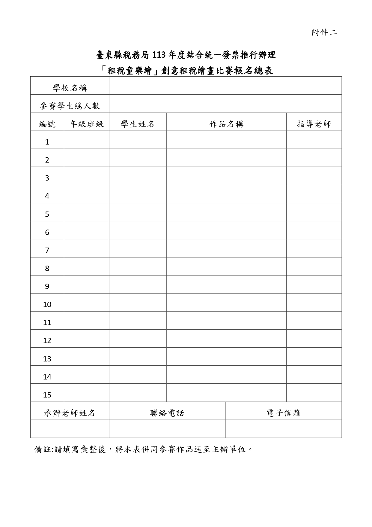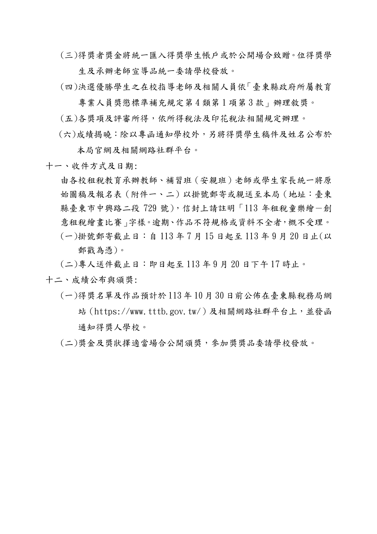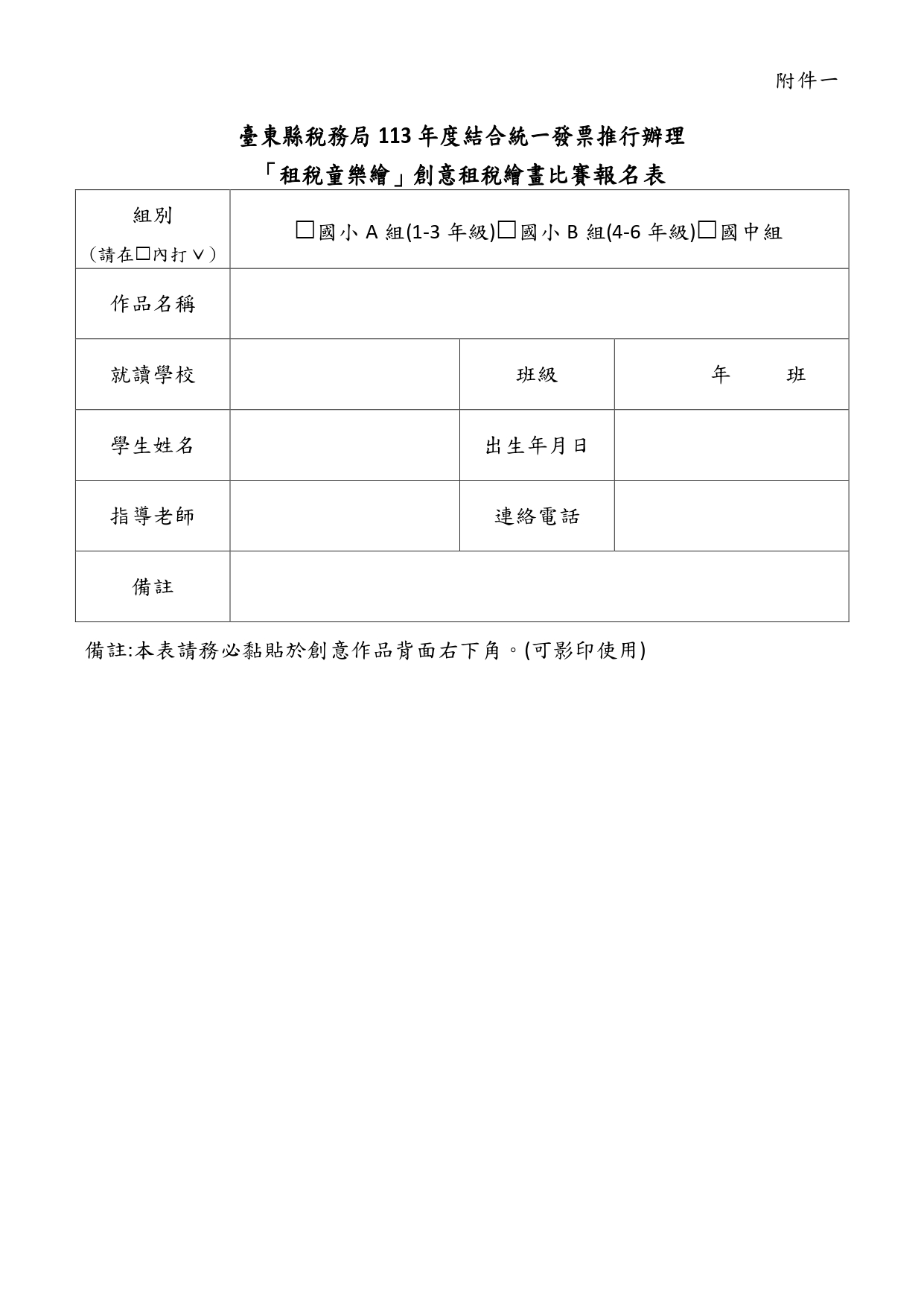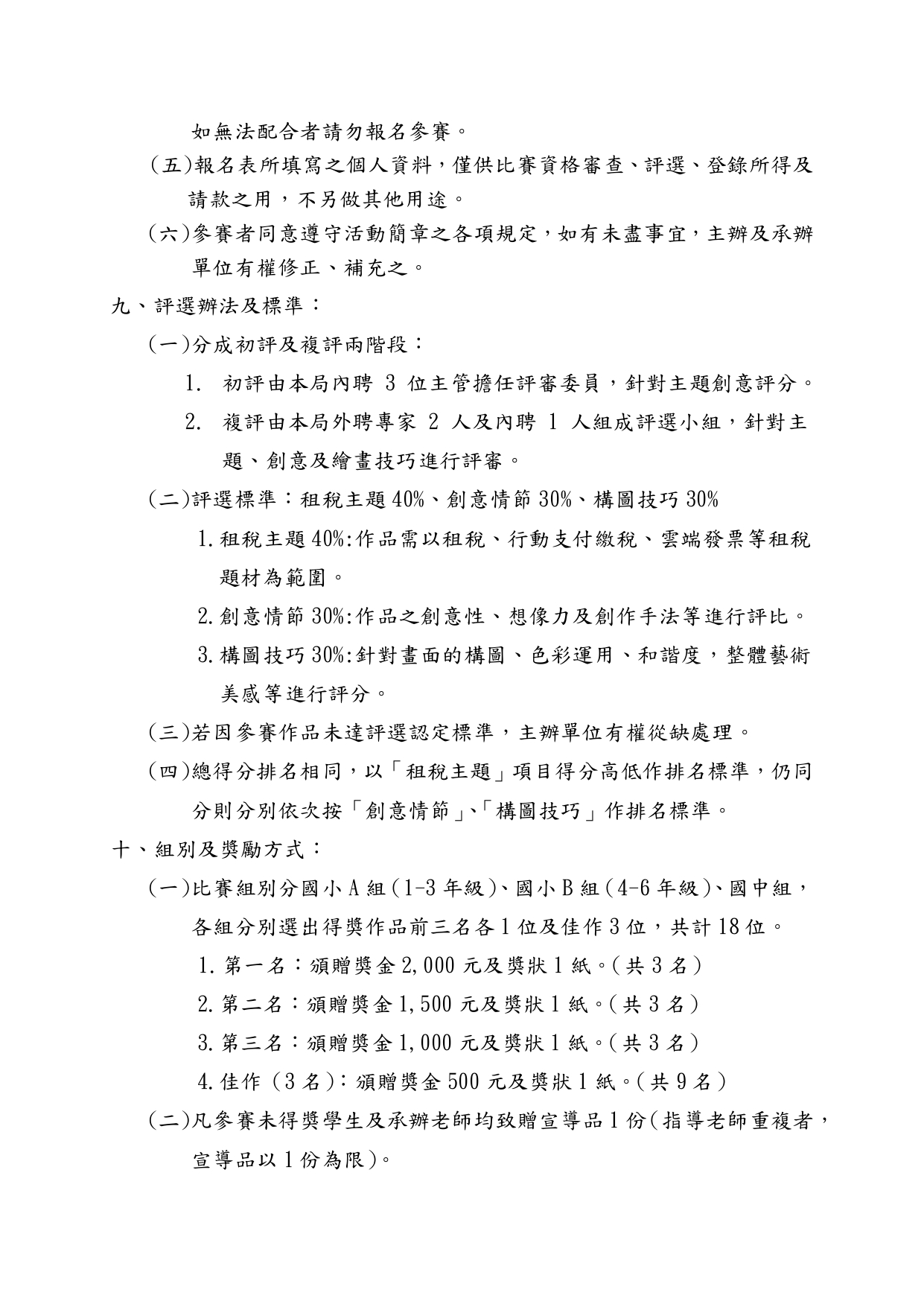 【協助公告】台東稅務局「租稅童樂繪」創意租稅繪畫比賽活動 台東稅務局 「租稅童樂繪」創意租稅繪畫比賽活動(一) 收件日期:自113年7月15日起至113年9月20日止。 (二) 參賽對象:臺東縣各國中、國小在籍學生。 (三) 比賽分組:國小A組(1至3年級)、國小B組(4至6年級)、國中組(7至9年級)。 (四) 獎勵辦法:各組選出前三名及佳作3名頒贈獎金及獎狀。 (五) 凡參加比賽之學生均致贈宣導品1份。 Attachments: 附件1[ ]191 kB 附件2[ ]248 kB 簡章1[ ]606 kB 簡章2[ ]688 kB 簡章3[ ]573 kB 簡章4[ ]477 kB 海報[ ]4564 kB 上一篇 下一篇