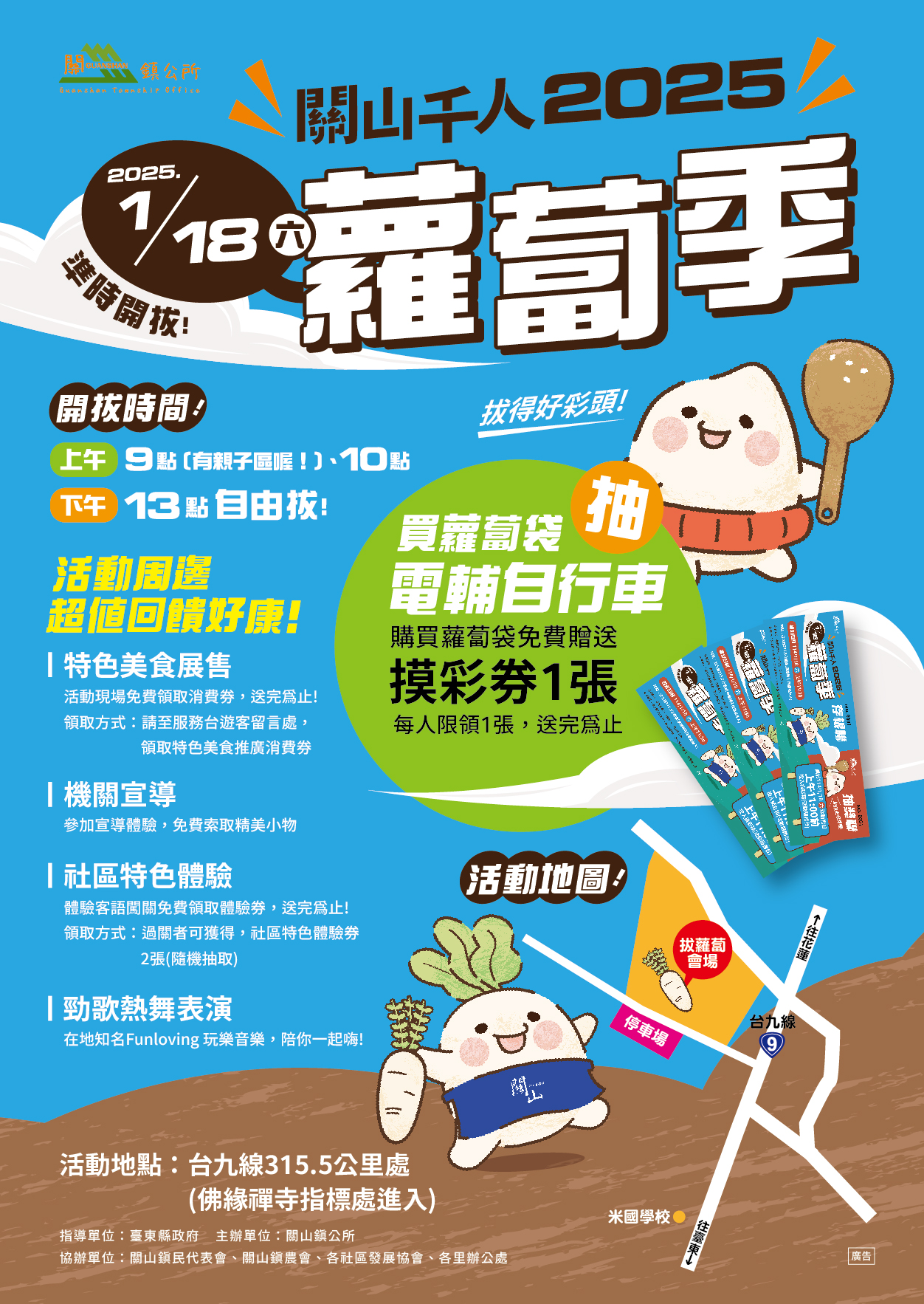 〈轉知〉臺東縣關山鎮公所辦理「2025關山千人蘿蔔季活動」 活動訂於114年1月18日(六)假台東縣關山鎮蘿蔔田園(台九線315.5公里處)舉辦,好山好水的關山孕育出鮮甜肥美的白蘿蔔,現場除了拔蘿蔔體驗還有舞團展演、兌換消費券、體驗券及摸彩券等多項活動,另有神秘彩蛋贈送精美小禮物,內容豐富歡迎一同共襄盛舉 上一篇 下一篇