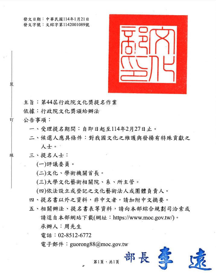 [ 函轉 ]文化部第44屆行政院文化獎提名作業公告
