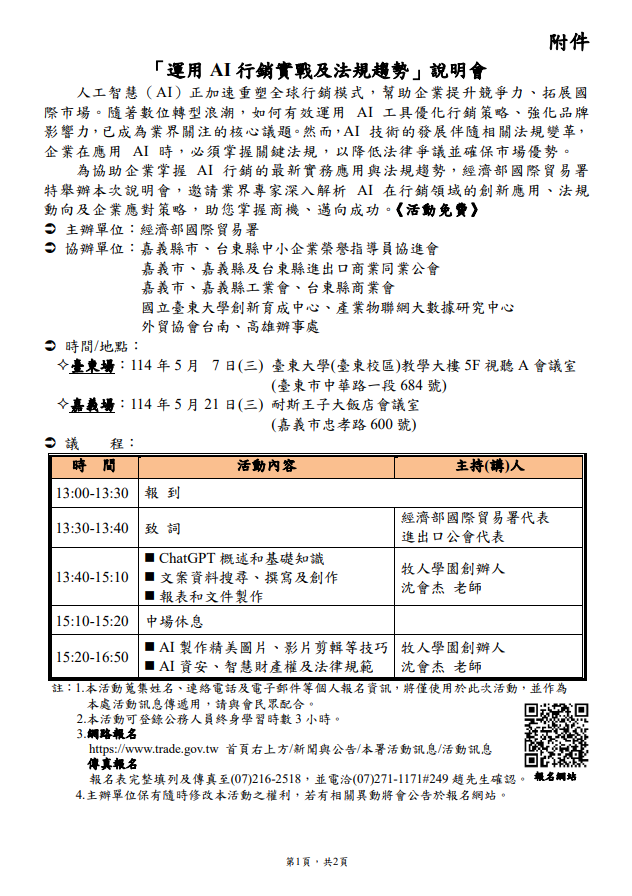 經濟部國際貿易署於114年5月間在臺東及嘉義各辦理1場「運用AI行銷實戰及法規趨勢」說明會