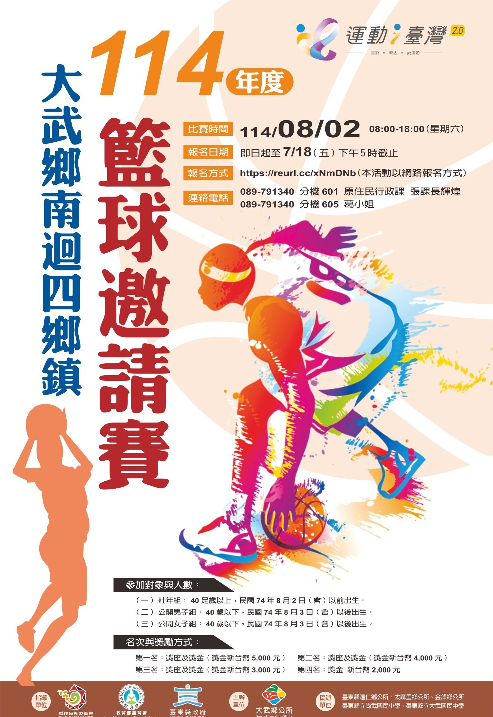 為推廣籃球運動與健康生活,大武鄉公所訂於114年8月2日(星期六)舉辦「114年度大武鄉南迴四鄉鎮籃球邀請賽」,歡迎南迴四鄉鎮熱愛籃球的朋友踴躍報名參加。