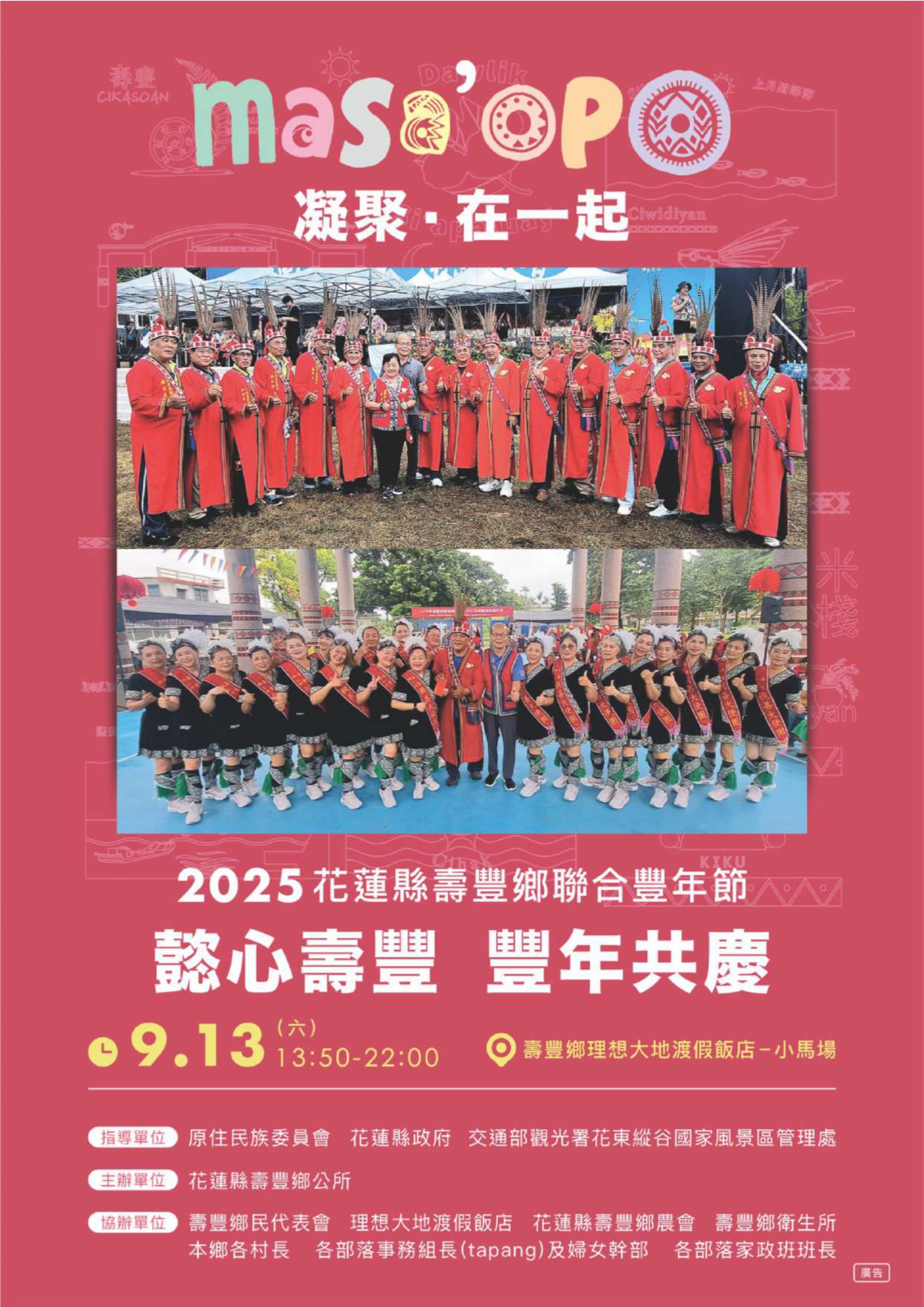 花蓮縣壽豐鄉舉辦「2025年懿心壽豐 豐年共慶~聯合豐年節」 一、 活動資訊如下: (一) 活動日期:114年9月13日(星期六)。 (二) 活動時間:下午13時50分至22時。 (三) 活動地點:壽豐鄉理想大地渡假飯店-小馬場。 二、 活動內容除了以歌舞展演,會場中特別規劃原住民族傳統文化美食區、手工藝、農特產展售區等,並積極配合各項政策宣導攤位,推展本鄉在地特色農產品、美食、手工藝品及政令,以增加本鄉曝光度及知名度,歡迎蒞臨參與活動。 上一篇 下一篇