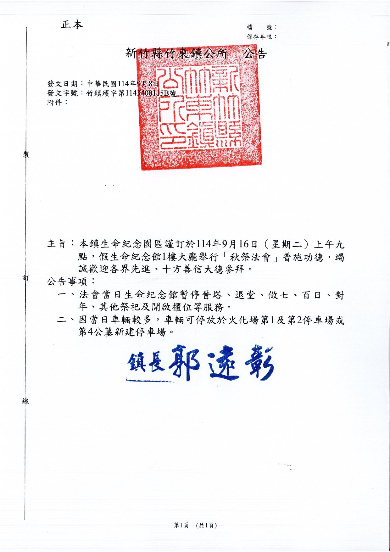 檢送本鎮生命紀念園區114年度「秋祭法會」公告1份