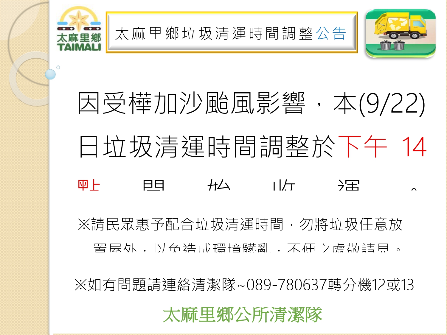 因受樺加沙颱風影響,本(9/22)日垃圾清運時間調整於下午14點開始收運