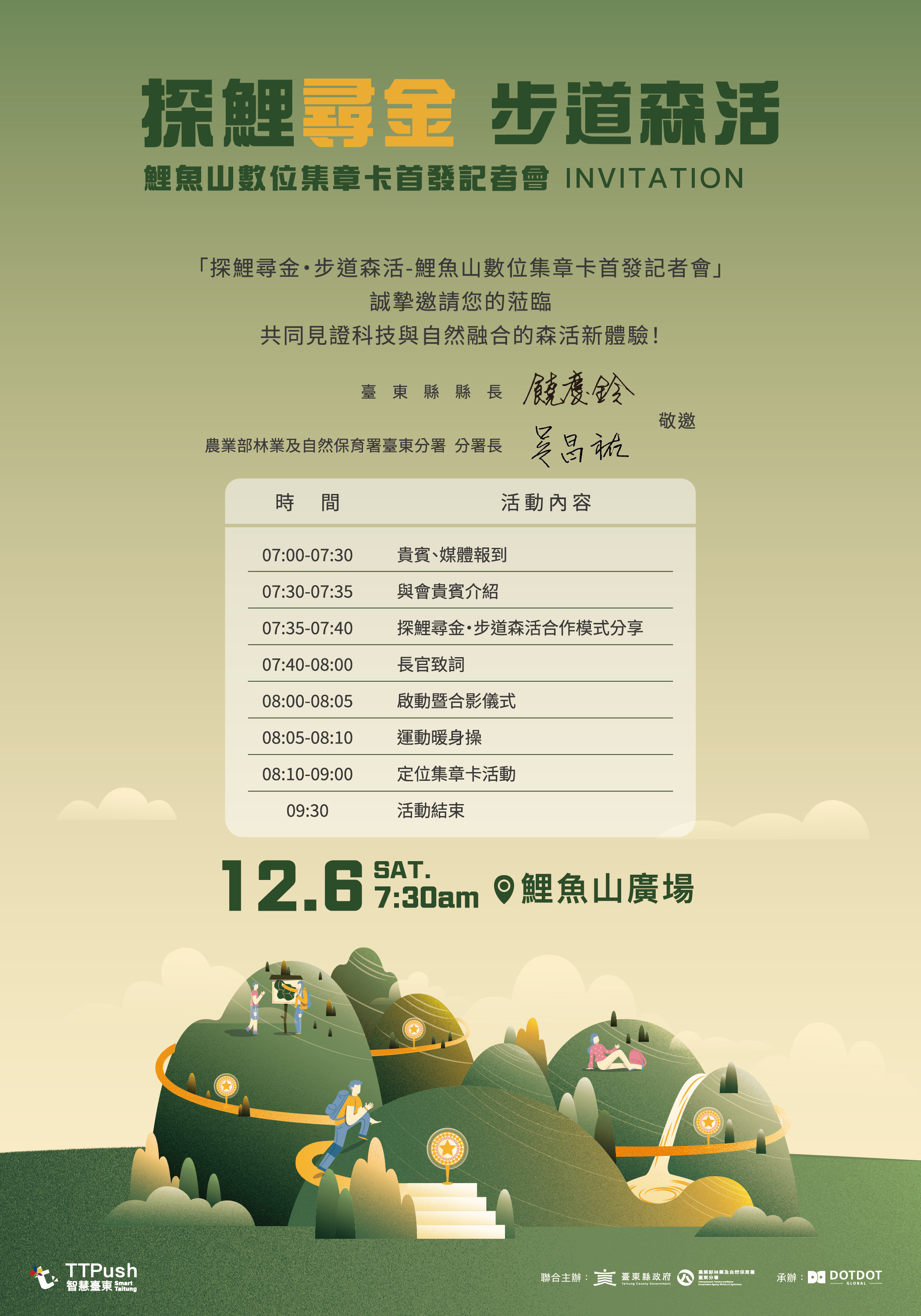 檢送臺東縣政府訂於114年12月6日(星期六)上午7時30分假臺東市鯉魚山廣場舉行「探鯉尋金‧步道森活」 Attachments: 376540000A_1140262150_ATTACH1 (1).jpg[ ]2321 kB 上一篇 下一篇