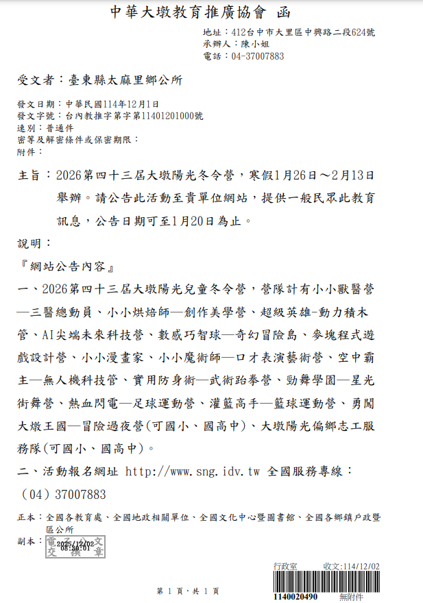 檢送中華大墩教育推廣協會2026第四十三屆大墩陽光冬令營,寒假1月26日~2月13日舉辦