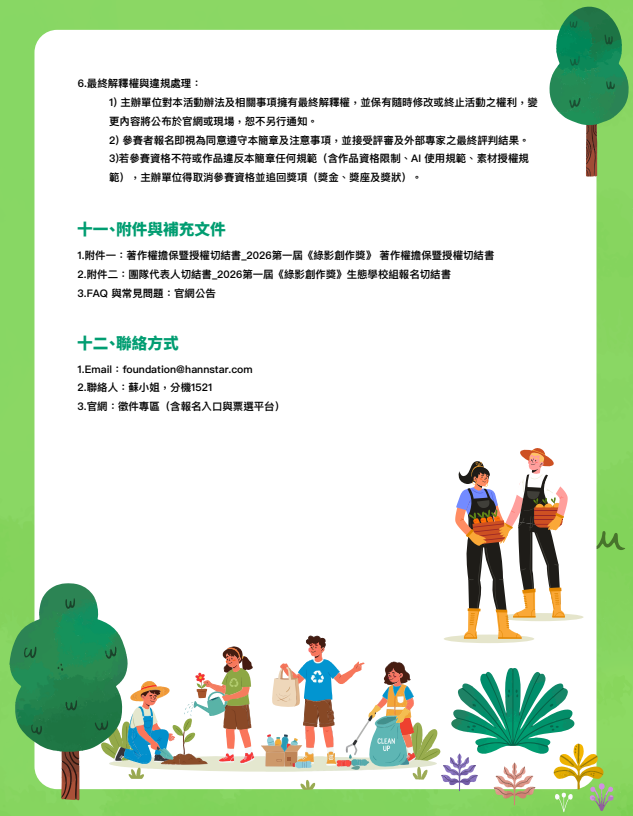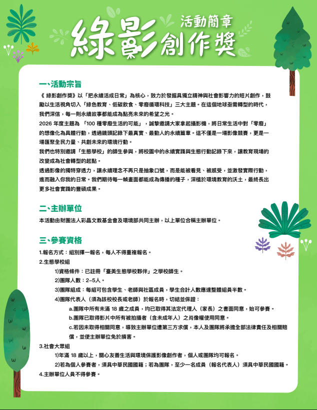 環境部與財團法人彩晶文教基金會共同辦理之第一屆「綠影創作獎」徵件簡章及相關資訊