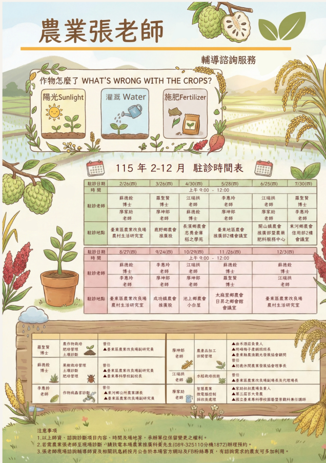 檢送 農業部臺東區農業改良場辦理本(115)年度「農業張老師輔導諮詢服務」