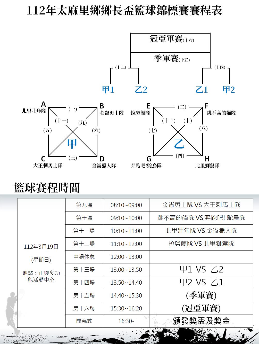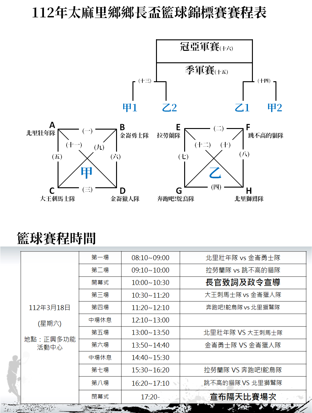 公告112年3月3日鄉長盃籃球錦標賽領隊會議簡報、會議紀錄及賽程表 說明: 一、本次領隊會議全部隊伍皆有派員參加。 二、112年鄉長盃籃球領隊會議簡報及會議紀錄如附件。 三、賽程時間表如下: Attachments: 0303112年鄉長盃籃球賽領隊會議簡報及會議紀錄會後上傳版01.pdf[ ]1374 kB 籃球簽到表.pdf[ ]273 kB 上一篇 下一篇