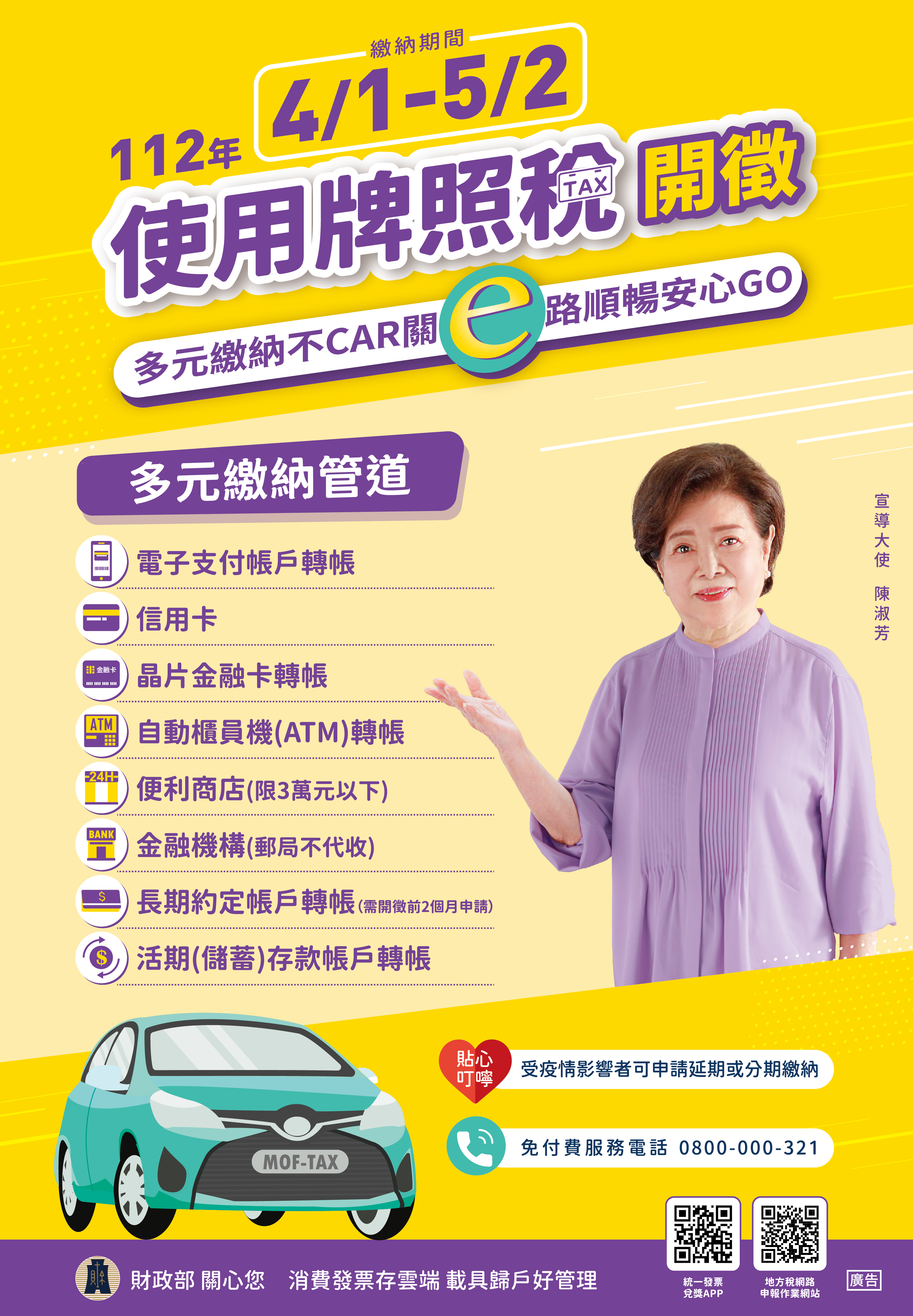 本年度使用牌照稅4月開徵 請納稅義務人按時繳稅 「本年度使用牌照稅自4月1日開徵,至5月2日截止,請依限繳納,以免受罰。 Attachments: 使用牌照稅dm.jpg[ ]4297 kB 上一篇 下一篇