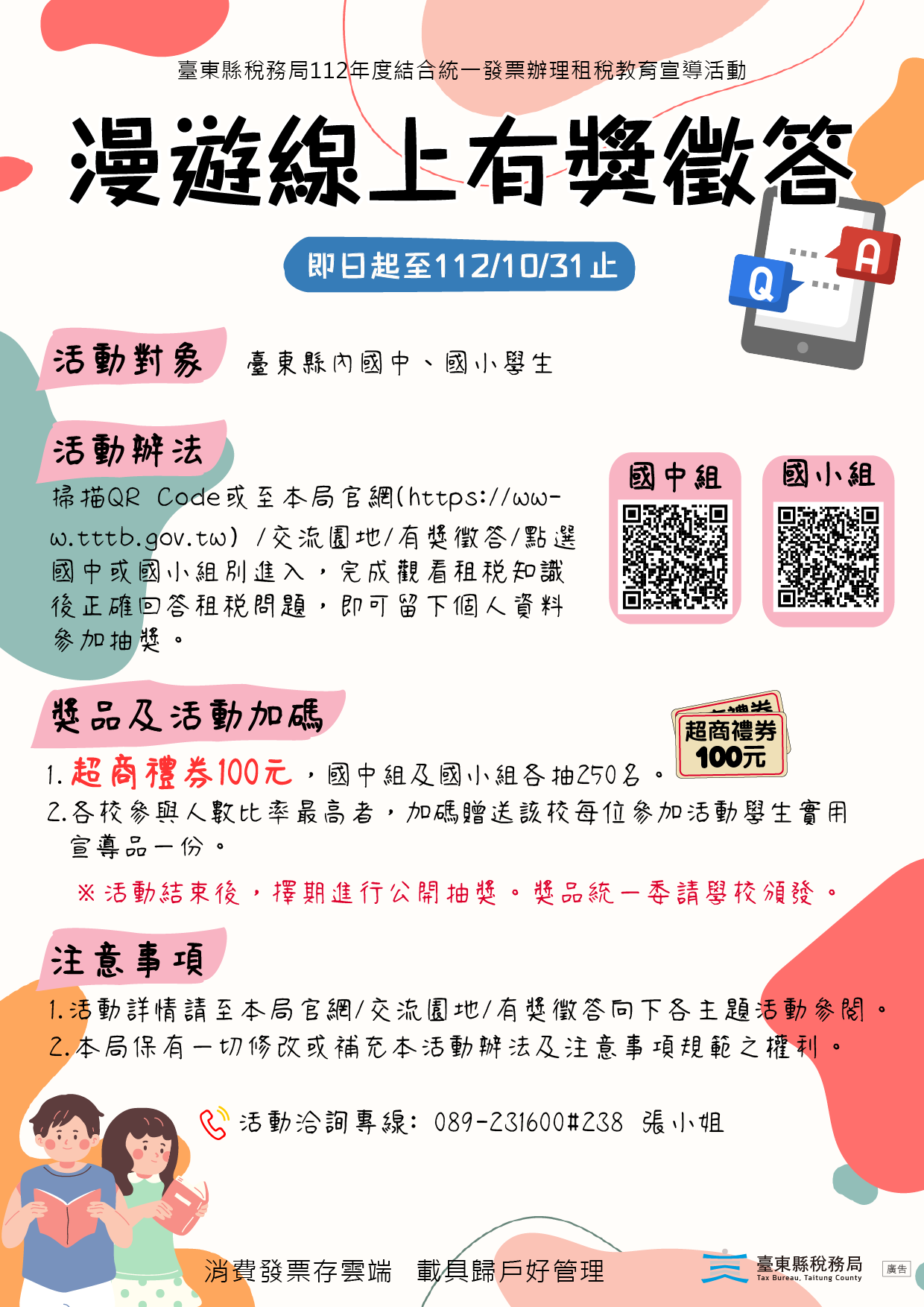 臺東縣稅務局112年度結合統一發票辦理租稅教育宣傳活動 臺東縣稅務局112年度結合統一發票辦理租稅教育宣傳活動 漫遊線上有獎徵答 Attachments: 漫遊線上有獎徵答-活動海報電子檔.png[ ]318 kB 上一篇 下一篇