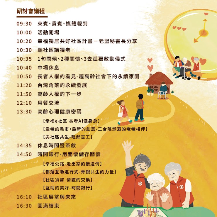 二、 該活動議程、講者資訊、交通方式、本年度合作社區簡介等活動相關資訊將陸續公布於活動官網,歡迎上網查閱。如有報名疑問,請洽中華民國老人福利推動聯盟承辦人梁君瑜(電話:02-25927999#236)。
