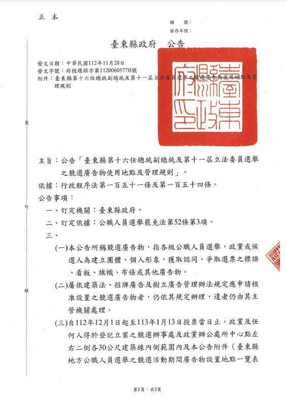 113年「臺東縣第十六任總統副總統及第十一屆立法委員選舉之競選廣告物使用地點及管理規則」公告 Attachments: 競選活動期間廣告物設置地點一覽表及使用管理規則.pdf[ ]313 kB 上一篇 下一篇