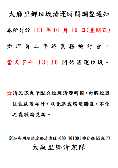太麻里垃圾清運時間調整通知