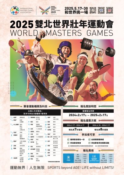 【轉知】臺北市政府體育局宣傳「2025雙北世界壯年運動會」報名訊息,詳請參閱。 (一)2025雙北世界壯年運動會(下稱2025雙北世壯運)由臺北市政府及新北市政府共同主辦,預計於113年2月17日下午2時開放賽會報名,歡迎有意者參與。 (二)2025雙北世界壯年運動會於2025年5月17至30日舉行,共有35種運動種類其中包含帕拉運動組別,年滿30歲無需選拔即可參賽,今年2月17日官網開放報名,等你一起和世界挑一場! (三)2025雙北世壯運官網連結(https://wmg2025. tw)。 Attachments: thumbnail.jpg[ ]69 kB 上一篇 下一篇