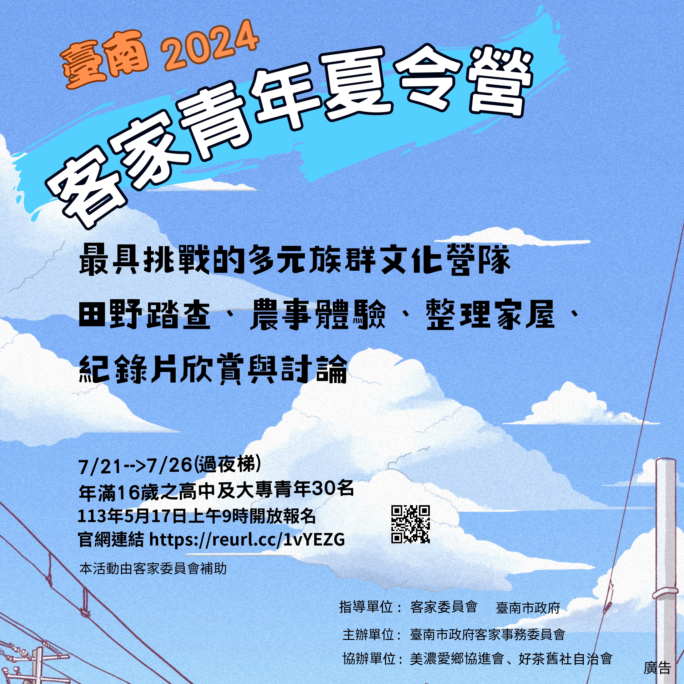 • /【轉知】臺南市政府辦理「2024臺南講客夏令營—『客家青年夏令營』」活動招募DM,鼓勵報名參加