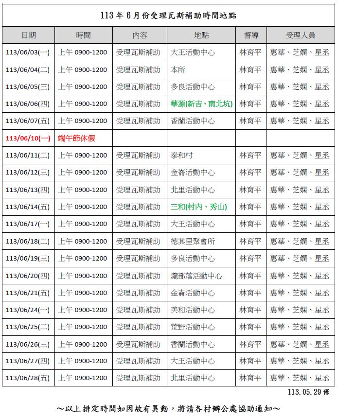 【公告】太麻里鄉113年6月份受理瓦斯補助時間地點