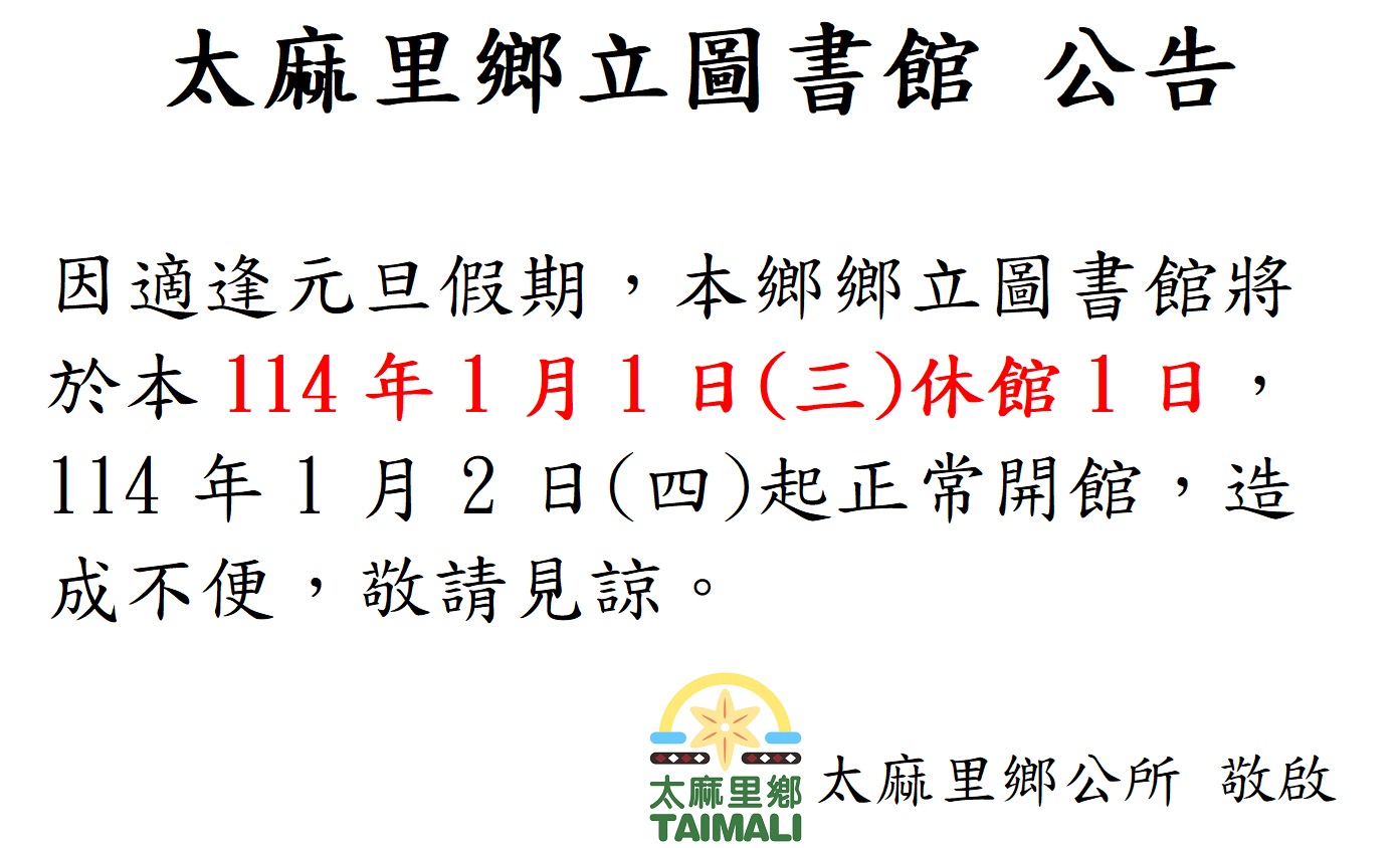 適逢元旦假期,太麻里鄉鄉立圖書館將於本114年1月1日(三)休館1日,114年1月2日(四)起正常開館,造成不便,敬請見諒!