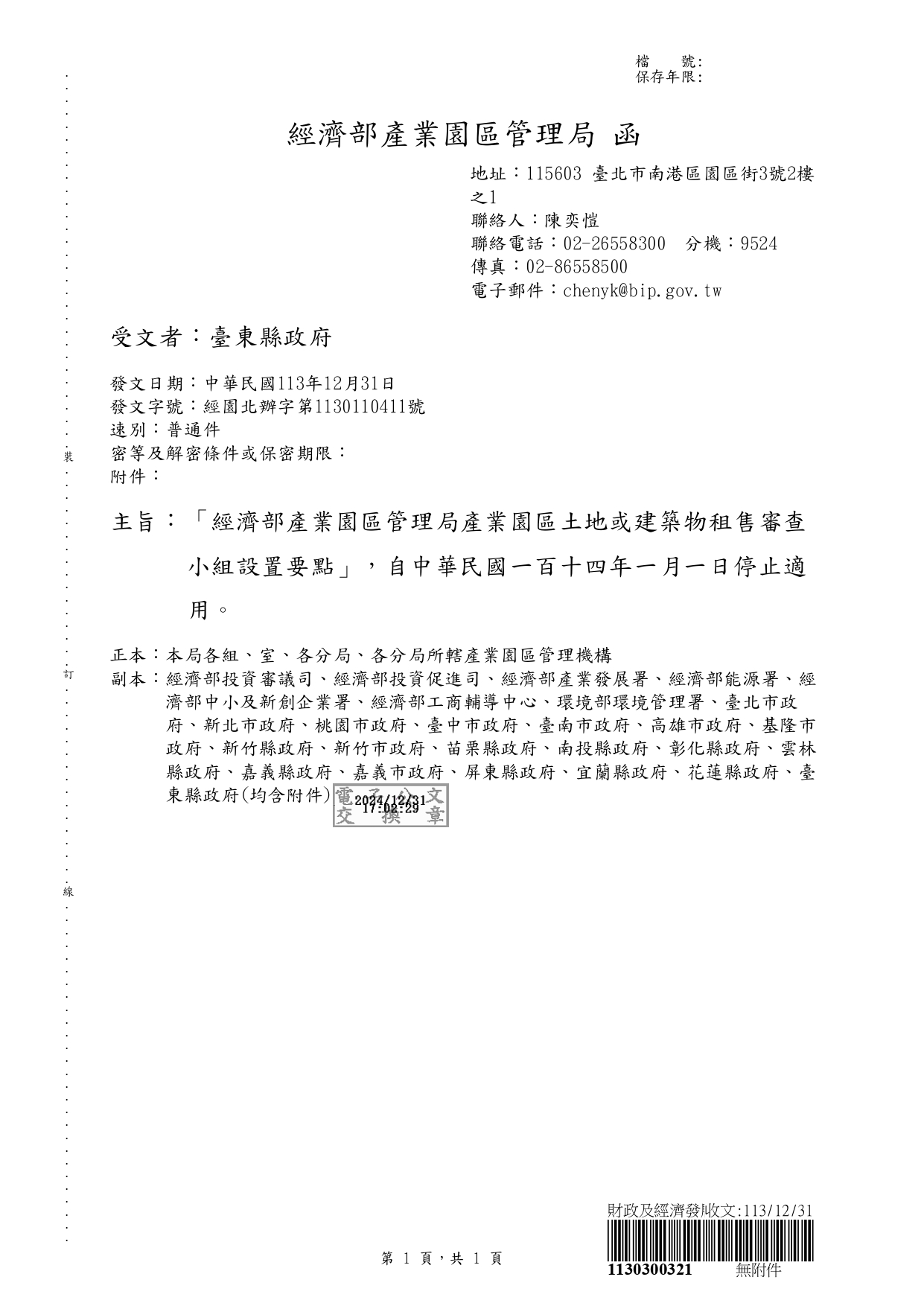 〈轉知〉「經濟部產業園區管理局產業園區土地或建築物租售審查小組設置要點」,自中華民國一百十四年一月一日停止適用