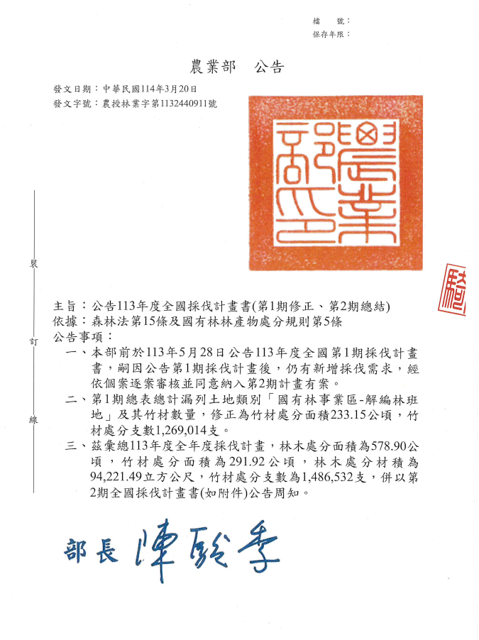 [ 轉知 ]農業部114年3月20日農授林業字第 1132440911號公告113年度全國採伐計畫書