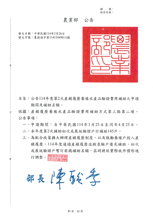 [ 檢送 ] 農業部「公告114年度第2次產銷履歷養殖水產品驗證費用補助之申請期間及補助名額」公告