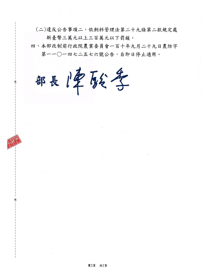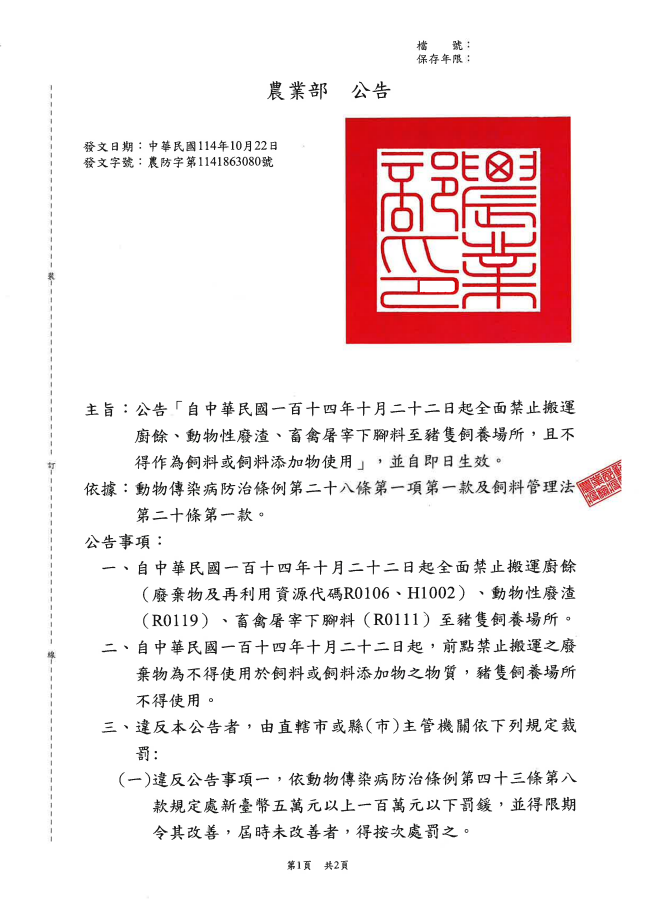【公告】農業部「自中華民國一百十四年十月二十二日起全面禁止搬運廚餘、動物性廢渣、畜禽屠宰下腳料至豬隻飼養場所,且不得作為飼料或飼料添加物使用」,並自即日生效