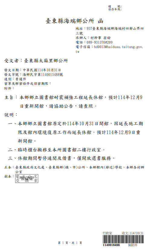 【轉知】臺東縣海端鄉公所圖書館耐震補強工程延長休館,預計114年12月9日重新開館公告