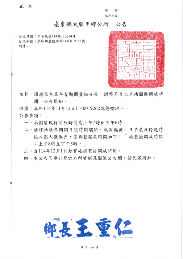 【公告】多良火車站園區開放時間異動通知