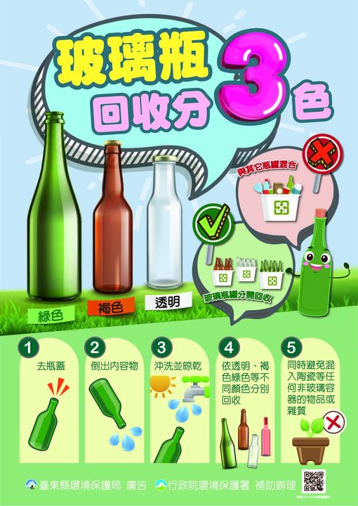 資源回收宣導part1 廢玻璃容器分色分類回收 玻璃容器 為行政院環境保護署公告應回收項目且為民眾生活中常用的物品,為了提升玻璃的回收效能 請將玻璃清洗分色去雜質 再將玻璃瓶分類三種顏色:透明、綠色及褐色 並去除非玻璃瓶外的雜質,才能作為一般玻璃窯爐的進料 「清洗去雜質」的動作,可以提高二次料的純度, 使再生料有更好的循環再利用! 請參考以下圖片喔! Attachments: 廢玻璃分三色.jpg[ ]76 kB 上一篇 下一篇